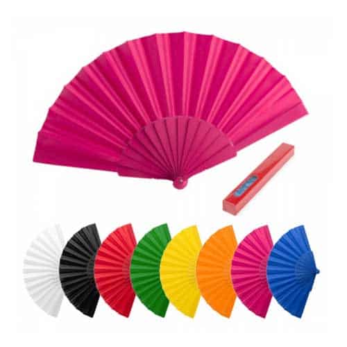 Abanicos de tela personalizados con logo, con varillas fabricadas en resistente plástico y tela en poliéster. Varillas y tela a juego, disponible en variada gama de colores. Presentado en caja individual blanca con ventana.