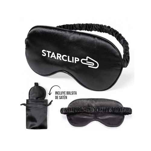 Antifaz publicitario, antifaz descanso en suave satén, con cinta elástica a juego. Presentado en bolsita individual de satén con cierre de cordón a juego. Funda Satén