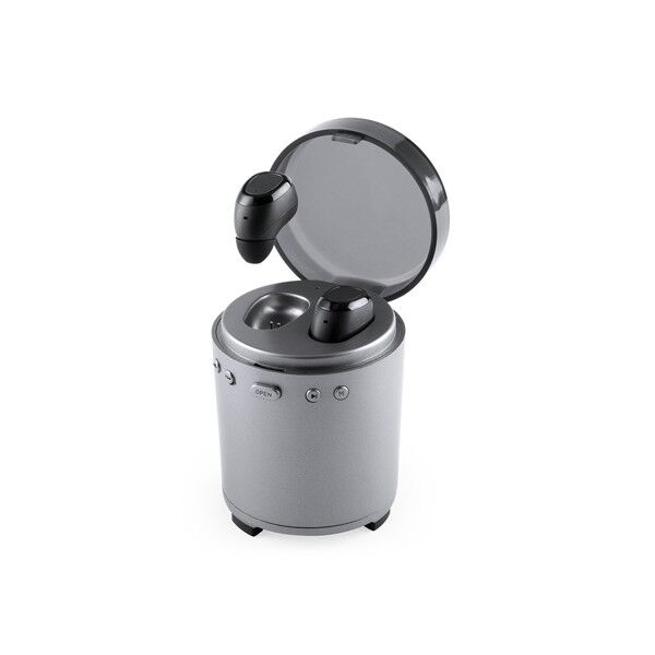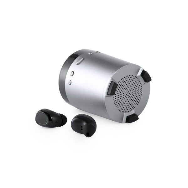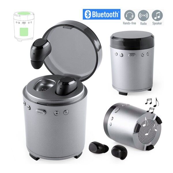 Set de altavoz con auriculares intraurales integrados. Conexión Bluetooth® y doble función auriculares + altavoz. Sobrio diseño bicolor, con panel de control integrado en el altavoz. Función manos libres, radio FM y base de carga para auriculares con tapadera y luz de estado de carga. Recargables mediante cable USB -incluido-, con base antideslizante y presentado en atractiva caja de diseño.