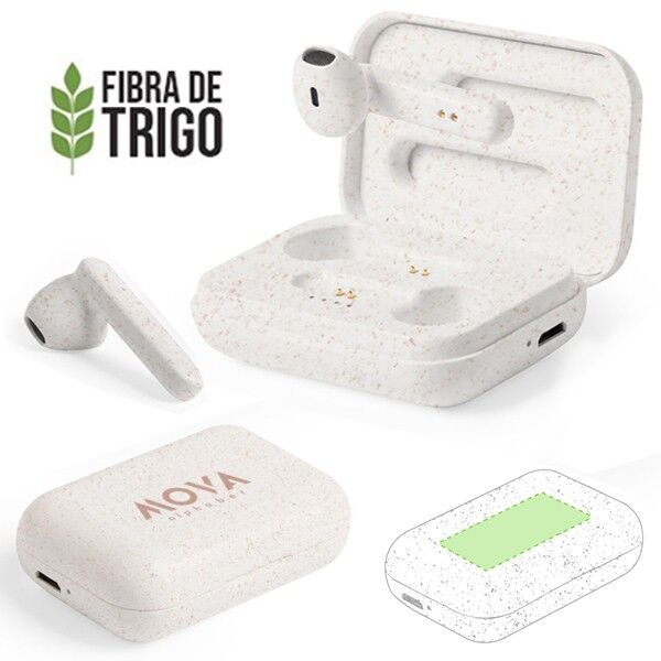 Auriculares intraurales de línea nature. Conexión Bluetooth® 5.0 y carcasa en caña de trigo, para así fomentar la utilización de materias primas naturales y reducir las emisiones contaminantes. De diseño ergonómico, incluyen panel de control táctil integrado en el auricular, con base de carga a juego y luz LED de estado de carga. Función manos libres y recargables, con cable micro USB incluido. Presentados en estuche individual de lujo con tapa de bisagra y en atractiva caja de diseño eco.