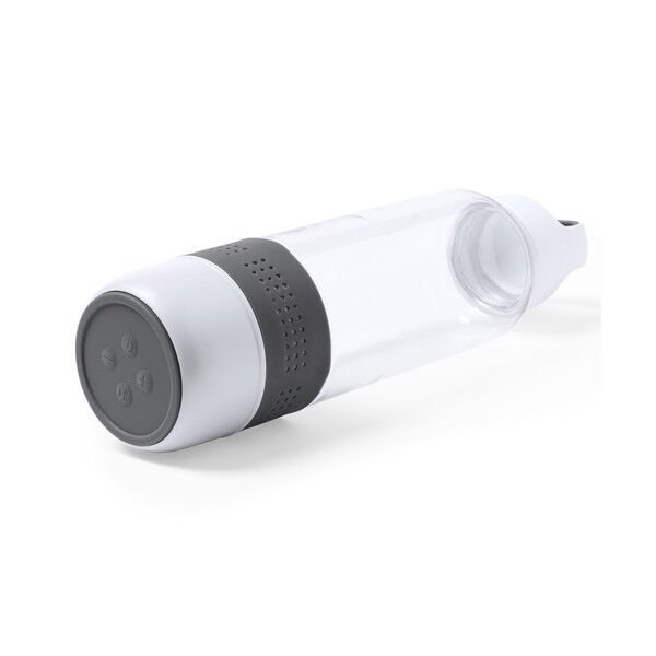 Bidón de 500ml de capacidad con altavoz bluetooth integrado en base. Cuerpo acabado en material tritán de resistencia al calor (70º) y libre de BPA en color transparente, con tapón de seguridad a rosca y asa integrada. Base altavoz de conexión bluetooth de 3W de potencia con función de manos libres y ranura para tarjetas micro SD de hasta 32 GB de capacidad. Compatible con iOS y Android, incluye cable de carga mini USB, tiene base antideslizante y viene presentado en atractiva caja de diseño.