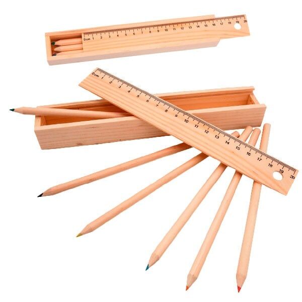 Set de 6 lápices en estuche de madera natural. Lápices en madera, con cuerpo redondo de acabado natural y minas en colores variada gama de vivos colores. Tapa de cierre anti deslizante con regla integrada de 20cm.