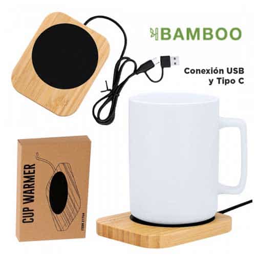 Calentador de tazas, fabricado con cuerpo de bambú. Ideal para mantener las bebidas a la temperatura ideal. Incluye un cable de carga de 1 metro con doble conexión Tipo-C y USB, adaptable a diferentes dispositivos. Materiales como el Bambú fomentan la utilización de materias primas naturales reduciendo las emisiones contaminantes. Además, el bambú proviene de una planta de gran resistencia y versatilidad, con crecimiento y regeneración rápida, siendo una excelente alternativa al uso de madera tradicional. Conexión USB y Tipo C