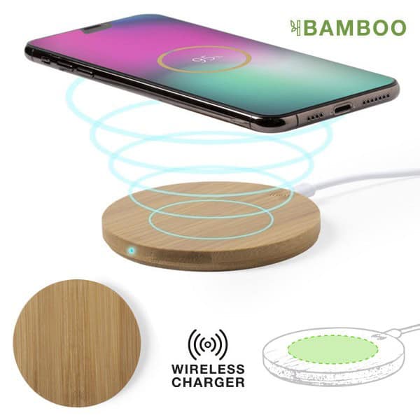 Cargador inalámbrico de línea nature y diseño circular. Carcasa en bambú procedente de cortes naturales. Indicador de estado de carga y compatible con dispositivos equipados con tecnología de carga inalámbrica. Amplia superficie de marcaje y presentado en atractiva caja de diseño eco.