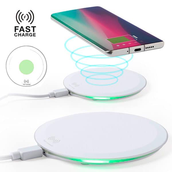 Cargador inalámbrico circular, con función carga rápida de 10W. Base antideslizante e indicador LED de estado de carga. Con puerto USB y capacidad para cargar dos dispositivos de forma simultánea, Cable micro USB incluido y compatible con smartphones con tecnología de carga inalámbrica. Presentado en atractiva caja de diseño.