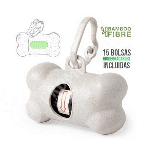 Dispensador de bolsas Leiren, en línea nature, fabricado en fibra de bambú. Con resistente cuerpo y diseño de hueso, mosquetón de transporte a juego y 15 bolsas biodegradables incluidas. 15 Bolsas Biodegradables Incluidas. Cantidad minima 500 unds.
