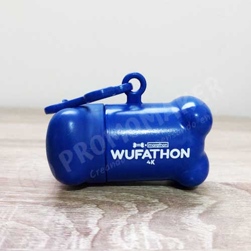Dispensador de bolsas, en material de plástico en vivos y variados colores y diseño de hueso. Con mosquetón de transporte a juego. Merchandising para mascotas para empresas.