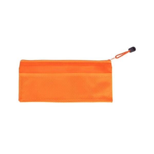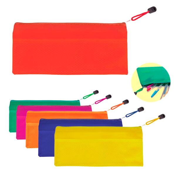 Estuche de cremallera acabado en PVC. 2 Compartimentos interiores con separador interior de rejila y cinta a juego en tirador para fácil apertura.Disponible en amplia gama de colores.