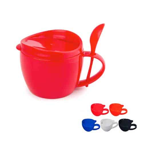 Incluye: Taza 450ml de material plástico, con tapa y cuchara.