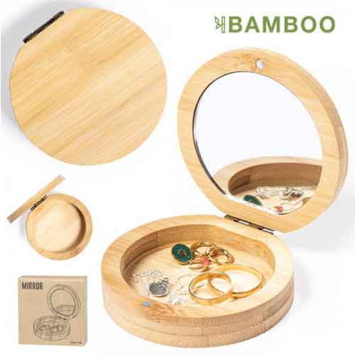 Joyeros personalizados con logo, de línea nature, con carcasa fabricada en bambú. Con espejo interior 1X y cierre magnético. Presentado en caja individual de diseño kraft.