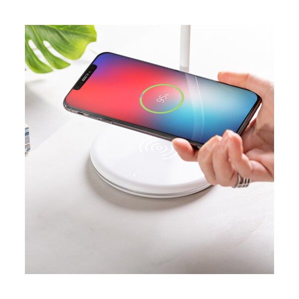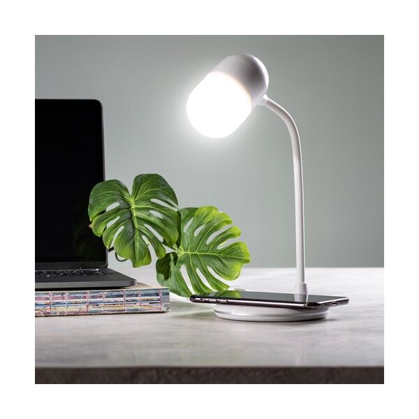 Lámpara multifunción todo en uno en acabado blanco, con altavoz Bluetooth® 4.2 de 3W de potencia y cargador inalámbrico integrados. 14 LEDs y 3 posiciones de iluminación (cálida, fría y media), ajustable en altura. Compatible con dispositivos móviles de carga inalámbrica, con cable cargador micro USB y viene presentada en una atractiva caja de diseño.