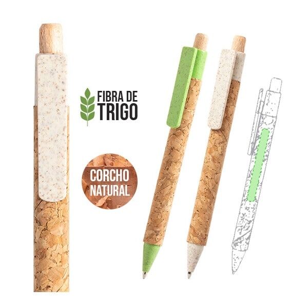 Bolígrafo de línea nature con cuerpo en corcho natural. Clip, punta y pulsador en caña de trigo, para así fomentar la utilización de materias primas naturales y reducir las emisiones de contaminantes. Con clip especialmente diseñado para marcaje en tampografía. De mecanismo pulsador y con tinta azul.