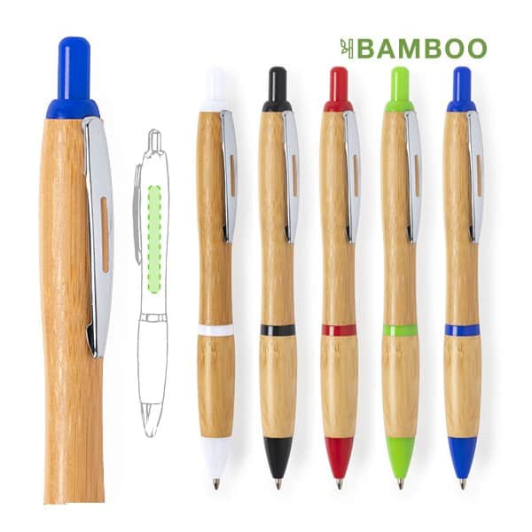 Bolígrafo con mecanismo pulsador de línea nature, con cuerpo en bambú y detalles en variada gama de colores. Con original clip metálico troquelado y cómoda empuñadura de bambú. Tinta azul.