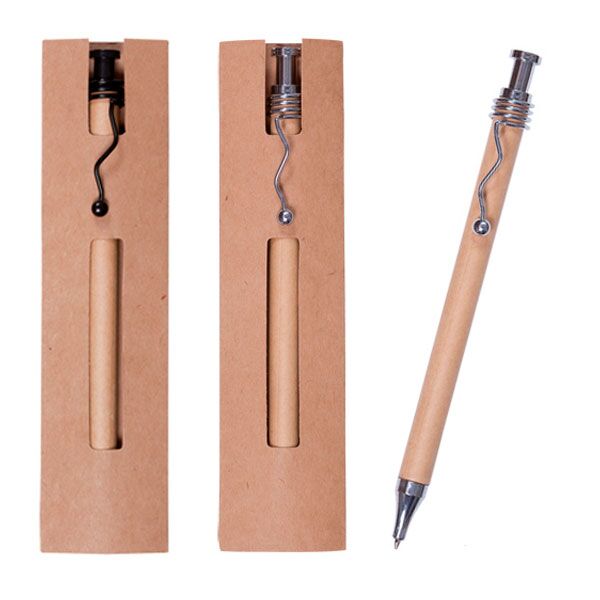Bolígrafo de mecanismo pulsador en original combinación de cuerpo en cartón reciclado de color natural y accesorios en elegantes colores negro y plateado. Con clip metálico de original terminación y presentado en estuche individual de cartón reciclado a juego. Tinta azul.
