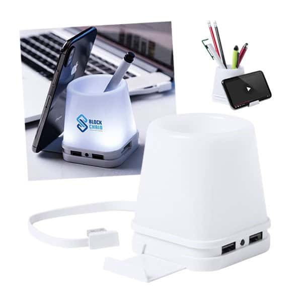 Original lapicero con puerto USB integrado. Retroiluminado por luz led, con 2 posiciones de iluminación y cuerpo en elegante color blanco para fácil marcaje. Incluye 4 puertos USB 2.0. Presentado en caja individual.