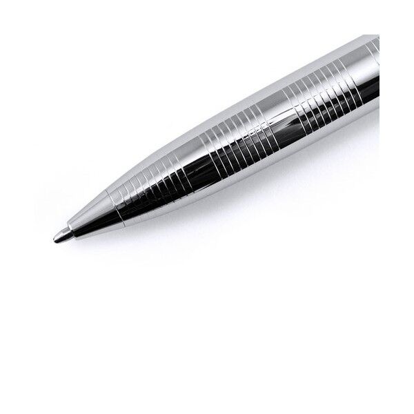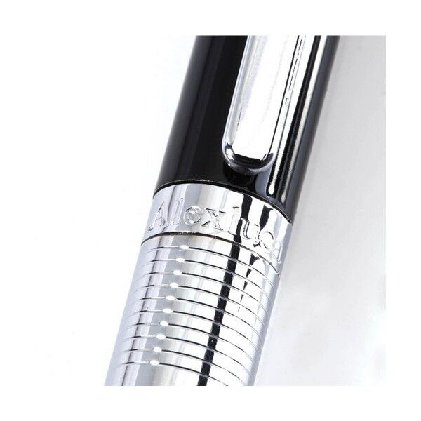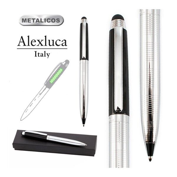 Bolígrafo puntero de Alexluca de mecanismo giratorio con suave cuerpo metálico, de elegante combinación de colores en plateado y negro. Clip y empuñadura de diseño a juego. Presentado en estuche individual negro con logotipo de la marca. Tinta azul.