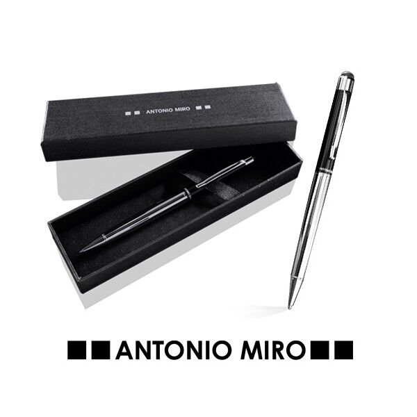 Bolígrafo puntero de Antonio Miró de mecanismo giratorio con suave cuerpo metálico, de elegante combinación de colores en plateado y negro. Clip y punta de diseño a juego. Presentado en estuche individual negro con logotipo de la marca. Tinta azul.