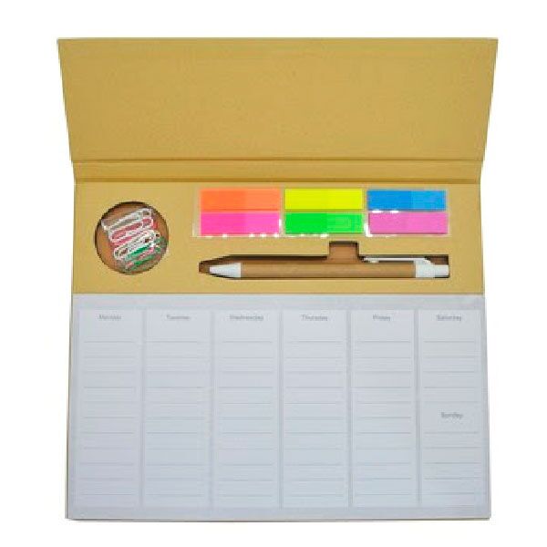 Incluye: Hojas marcadas de lunes a sábado (en ingles), 06 post it plastificados (anaranjado, amarillo, azul, rosado, verde, morado), clips de colores, lapicero ecológico tinta seca.