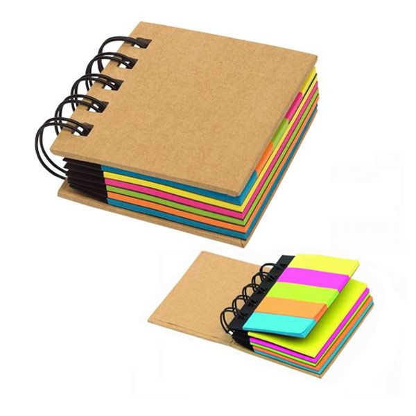 Contiene 5 tacos chicos en colores: celeste, anaranjado, verde limón, fucsia y amarillo y 5 post it pequeños en colores: amarillo, fucsia, verde limón, anaranjado y celeste.