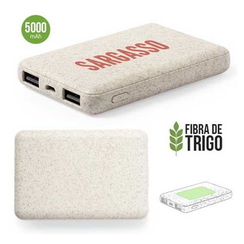Batería auxiliar externa de línea nature de tamaño ultra compacto, con carcasa en caña de trigo, para así fomentar la utilización de materias primas naturales y reducir las emisiones contaminantes. 5.000 mAh de capacidad de carga e indicador de estado de carga. Salida USB dual para carga simultánea de 2 dispositivos y entrada micro USB -cable incluido-. Con amplia superficie de marcaje y presentado en atractiva caja de diseño eco. Las capacidades mostradas en todas nuestras baterías auxiliares externas son reales, incorporando todas ellas baterías de grado A y no recicladas, con una vida útil de al menos 500 ciclos de carga y según normativa CE. Además, están fabricadas conforme a los estándares RoHS y en cumplimiento con los siguientes requisitos de seguridad: Sistema de protección contra sobrecarga del power bank. Sistema de protección contra descarga completa que proporciona una mayor durabilidad del power bank. Sistema de bloqueo para evitar cortocircuitos. Sistema de transferencia de carga constante, acorde con la capacidad del dispositivo de destino.