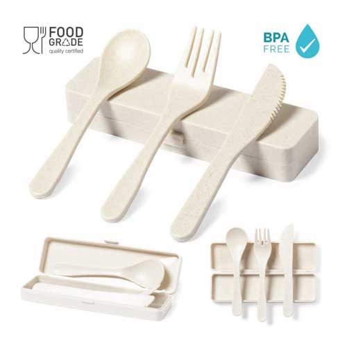 Set de cubiertos publicitarios, fabricados en PP de acabado veteado, libre de BPA, con estuche de presentación a juego. Incluye cuchara, tenedor y cuchillo. Certificación Food Grade, garantizando la seguridad cuando los alimentos entran en contacto con el material usado para fabricar el producto. 3 Piezas.