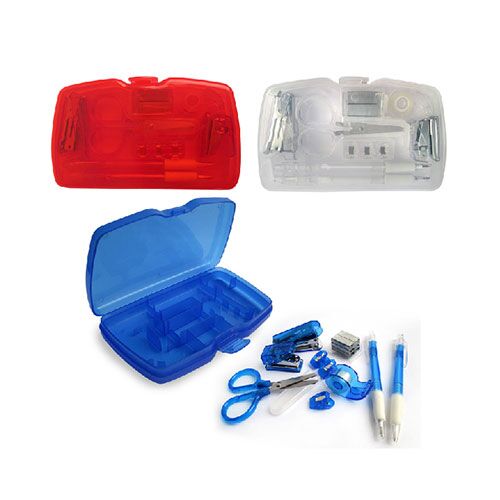 Incluye: Estuche de plástico traslúcido, 1 Tijera, 2 Lapiceros, 3 Ganchitos, 1 Cinta Adhesiva, 1 Perforadora de un hueco, 1 Engrapadora + repuestos.