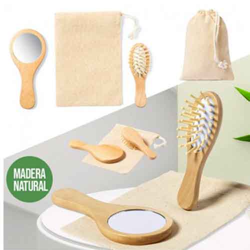 Set de espejo y cepillo, fabricados en madera natural. Presentados en funda 100% algodón, con cierre de cordón. 2 Piezas. Funda Algodón