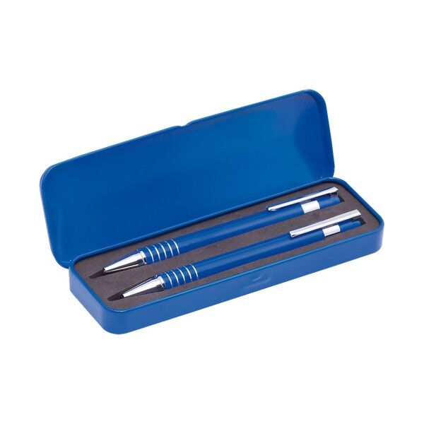 Set de bolígrafo de mecanismo pulsador y portaminas en original diseño bicolor. De cuerpo metálico en suave acabado de vivos colores y accesorios en colores plateados. Con empuñadura anillada y presentado en resistente estuche individual metálico a juego con suave espuma troquelada. Bolígrafo de cartucho jumbo con tinta azul y portaminas con minas de 0,7mm incluidas.